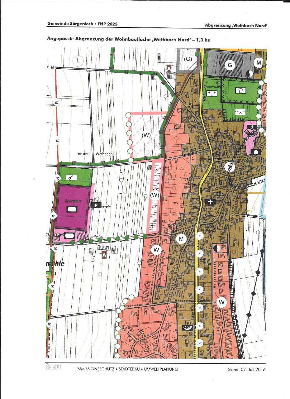 Im Flächennutzunngsplan 2025 wird die bauliche Entwicklungsmöglichkeit von Sörgenloch festgeschrieben. Der Flächennutzungsplan 2025 sieht für Sörgenloch das Baugebiet „Wethbach Nord“ mit 1,3 ha vor. Darüber hinaus ist eine Gewerbeentwicklung von 0,5 ha vorgesehen. Hier die Planungen in der Skizze: